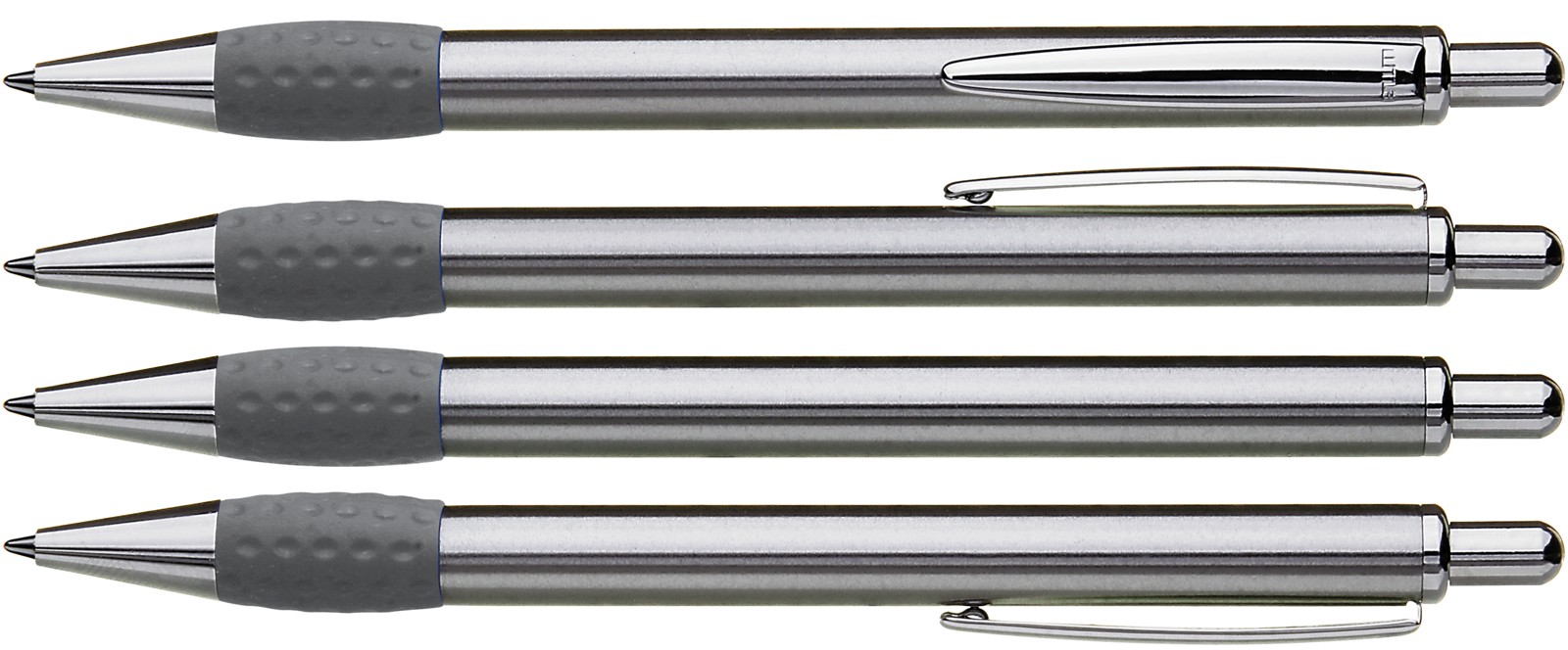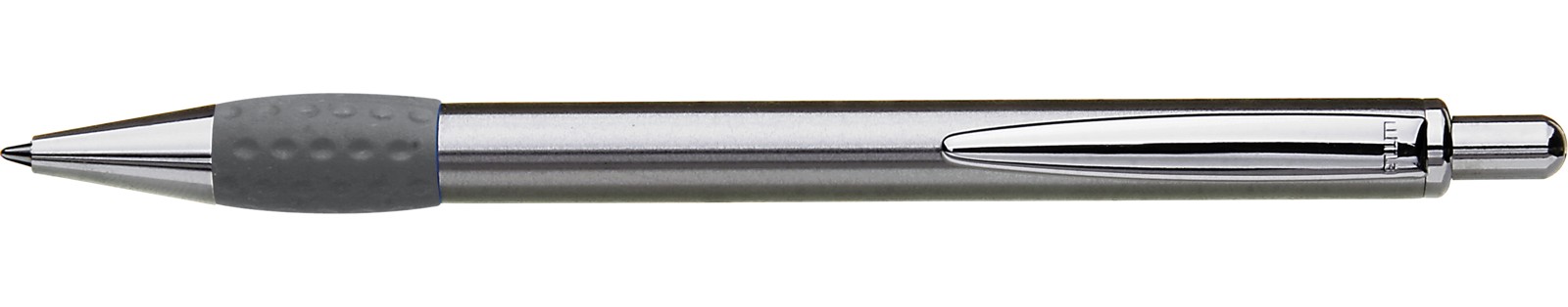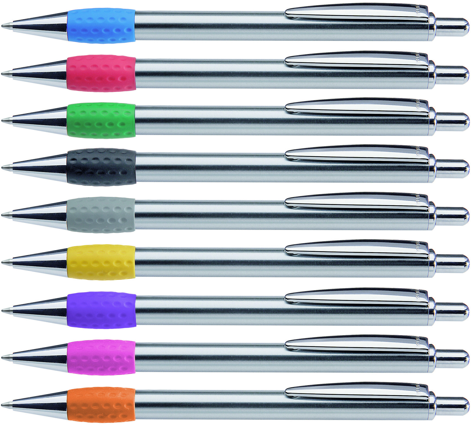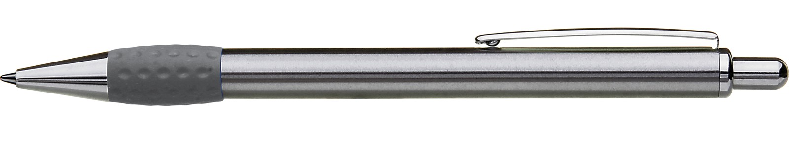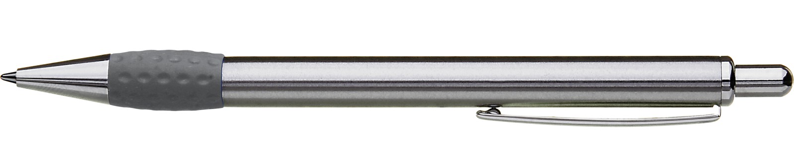 Metall-Druckkugelschreiber mit Schaft, Drücker, Clip und Spitze glanzverchromt. Gummigriffzone farbig.