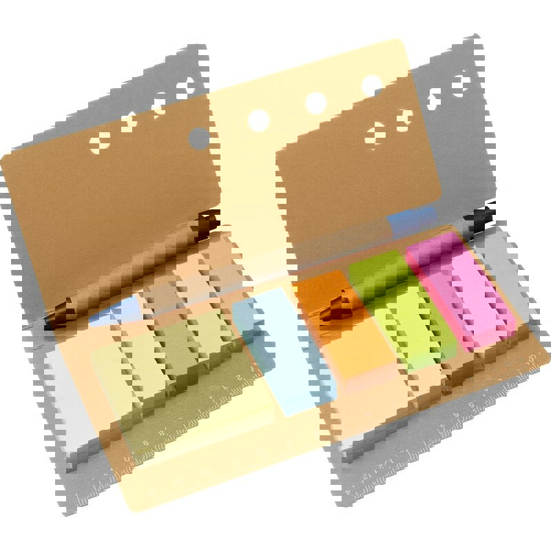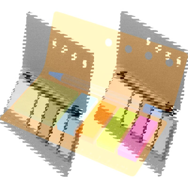 Haftnotizblock mit farblich passendem Kugelschreiber aus Recyclingkarton sowie originellem, zweifarbigem Design. Soft-Touch-Cover aus robustem Recyclingkarton mit selbstschließender Lasche in passender Farbe. Mit Stifthalter und 70 Blättern sowie 25 großen, 25 mittlelgroßen und 100 Mini-Haftnotizen. 70 Blätter Notizblock. 25 Haftnotizen 7,6 x 9 cm. 25 Haftnotizen 3,8 x 6 cm. 100 Mini Haftnotizen 1,2 x 4,8 cm. Reclycling Pappe Kugelschreiber Inklusive
