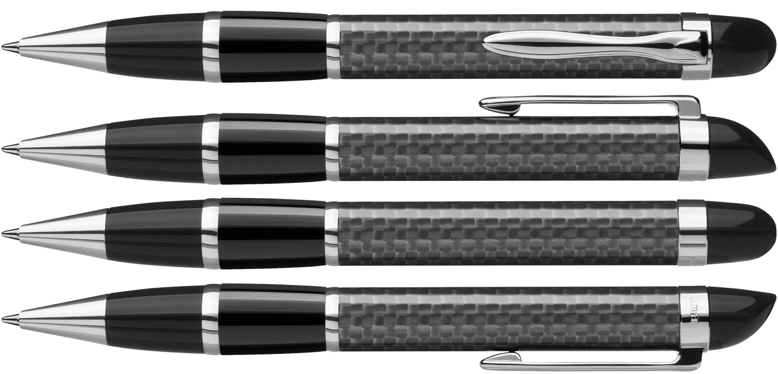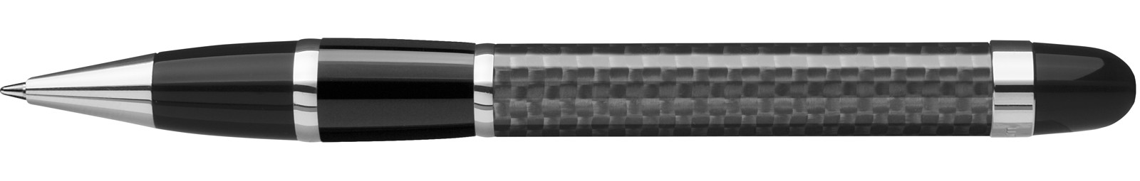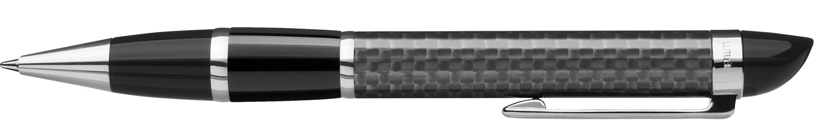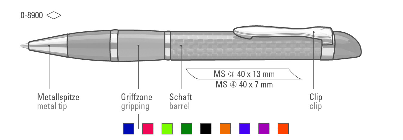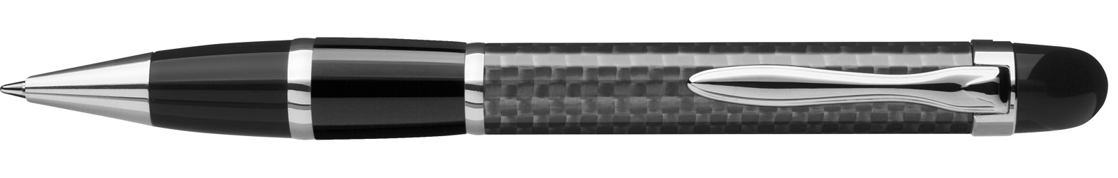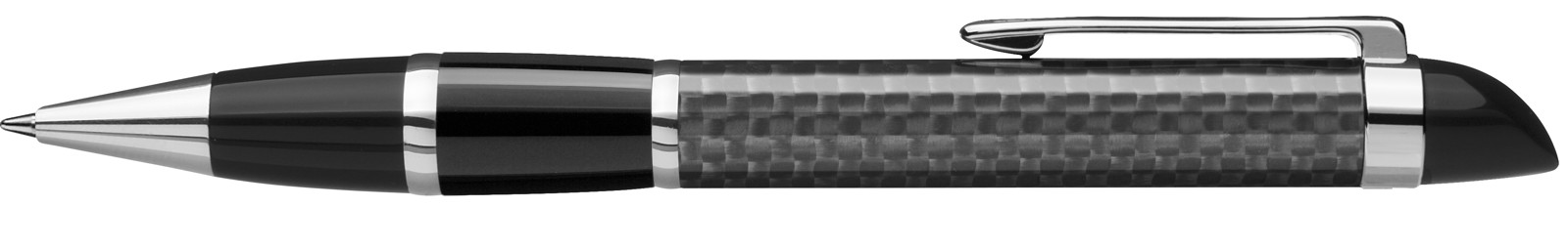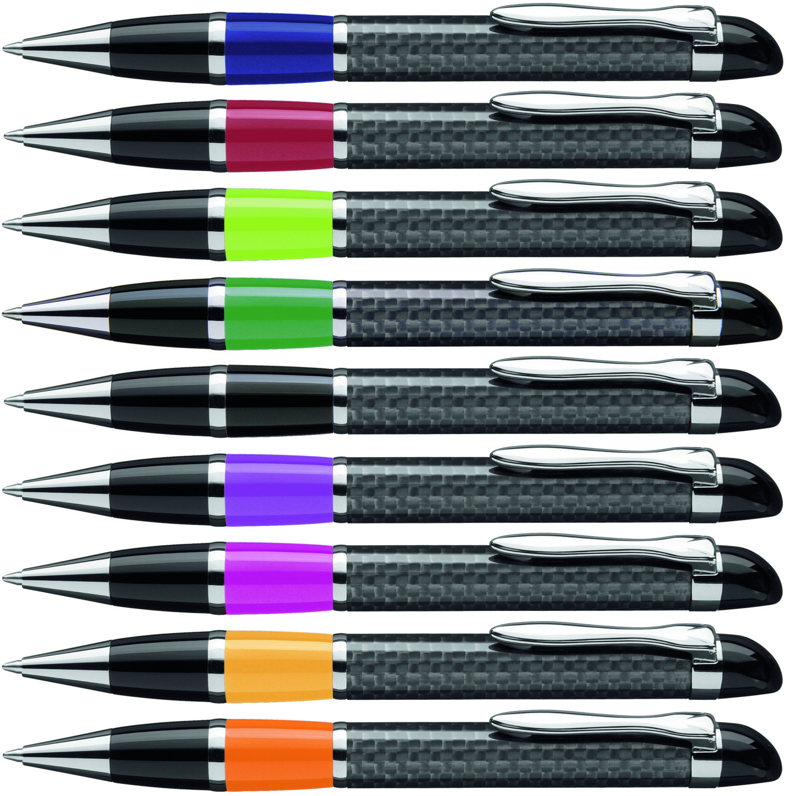 Edler Carbonfaser Metalldrehkugelschreiber mit farbiger Griffzone, flexiblem Metallclip, Metallzierring und Metallspitze glanzverchromt.
