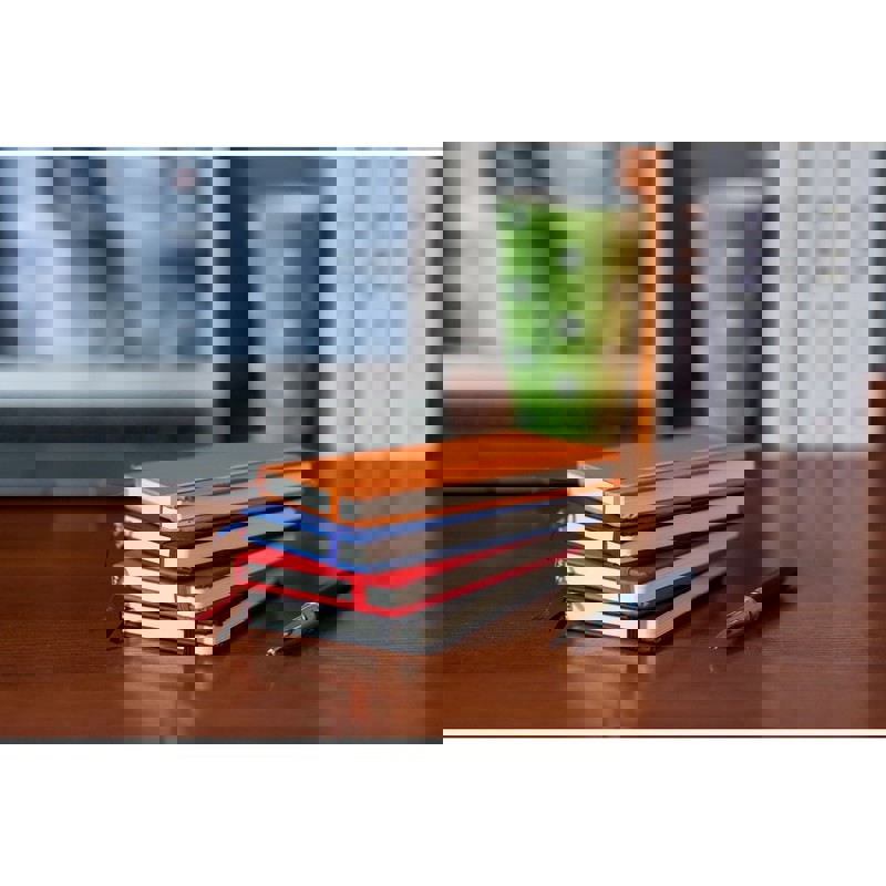 Notizbuch im Taschenformat ca. A6 mit 96 linierten Blättern (192 Seiten), Lesezeichenband zum einfachen Markieren der letzten Seite oder wichtiger Notizen, einem farblich passenden Gummibandverschluss, Hardcover aus PU