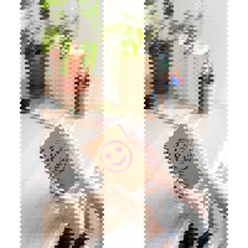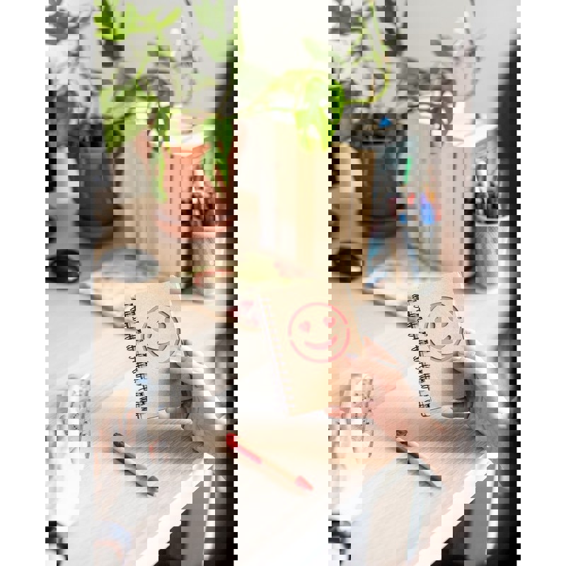 Notizbuch " lächelndes Gesicht" im Format ca. B7 mit 60 linierten Blättern (120 Seiten), mit Spiralbindung, inklusive Kugelschreiber mit farbigen Elementen, schreibt in blau, Produkt aus Papier und Kunststoff
