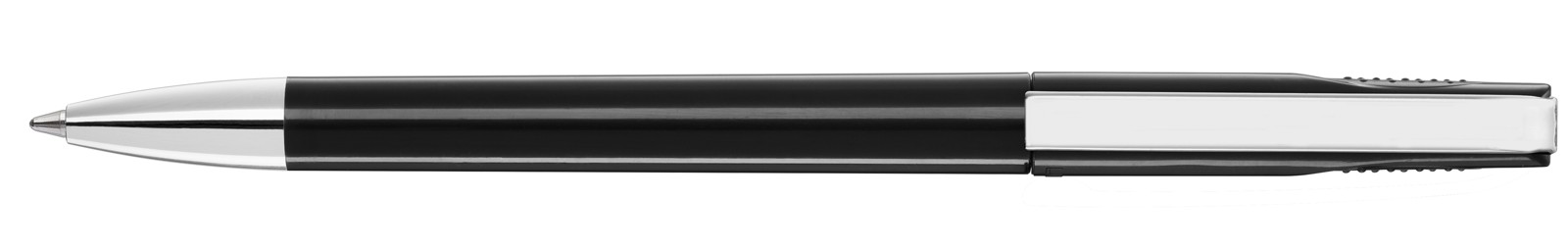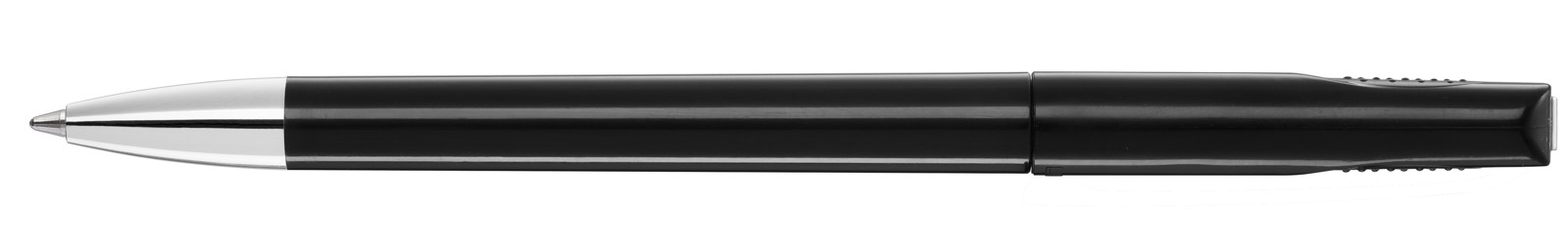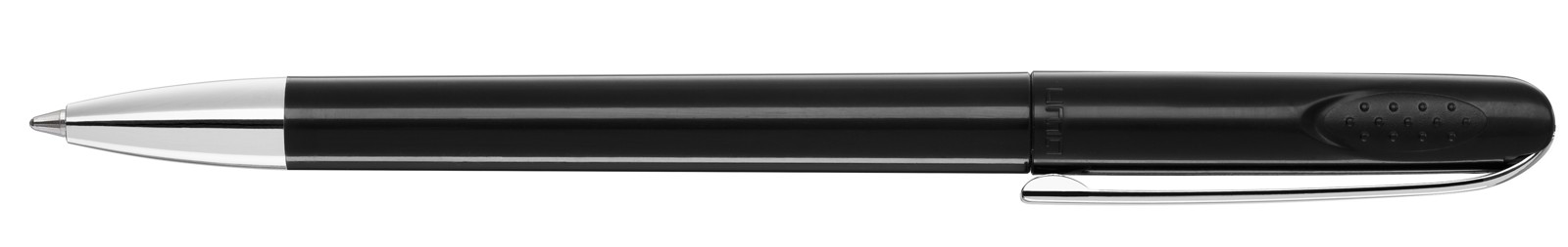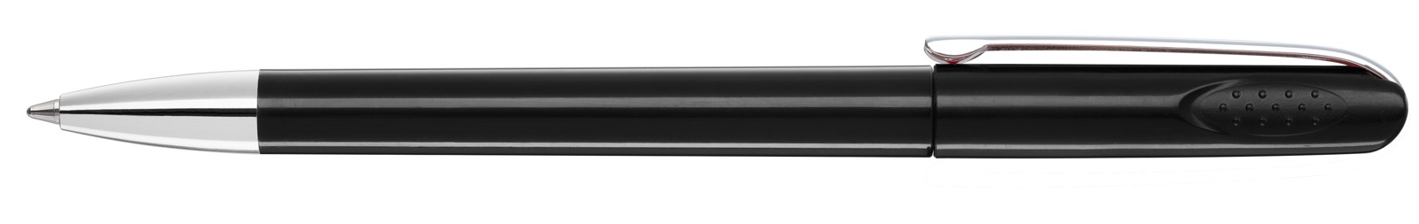 Drehkugelschreiber mit glänzend gedecktem Gehäuse, schwerer Metallspitze und Metallclip. Griffnoppen in der Kappe unterstützen den komfortablen Drehmechanismus.