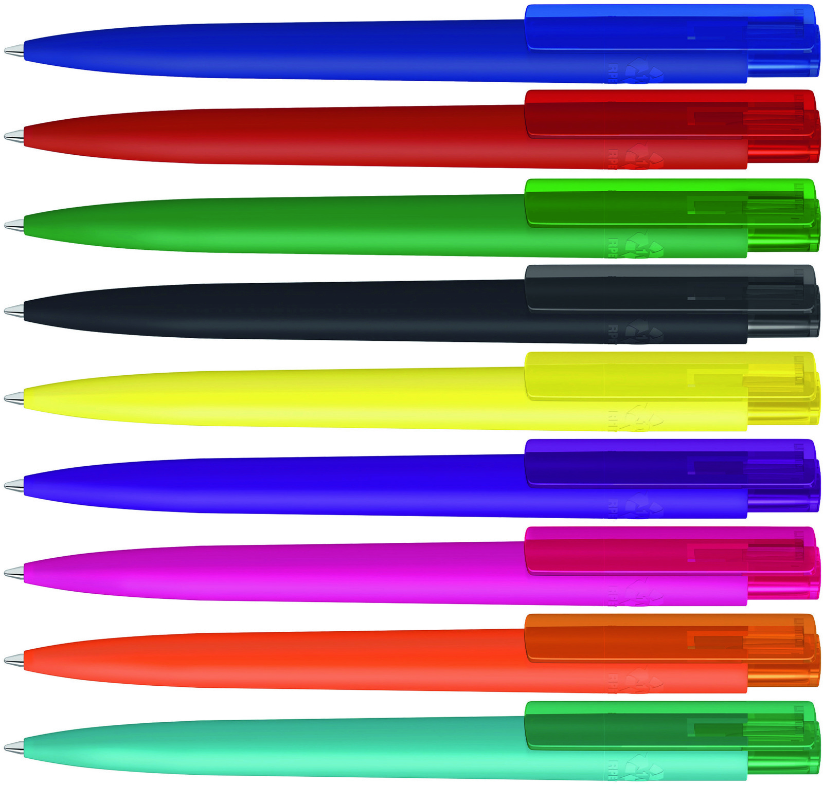 Druckkugelschreiber mit gummiertem Gehäuse aus recyceltem PET-Material mit transparent glänzendem Clip.