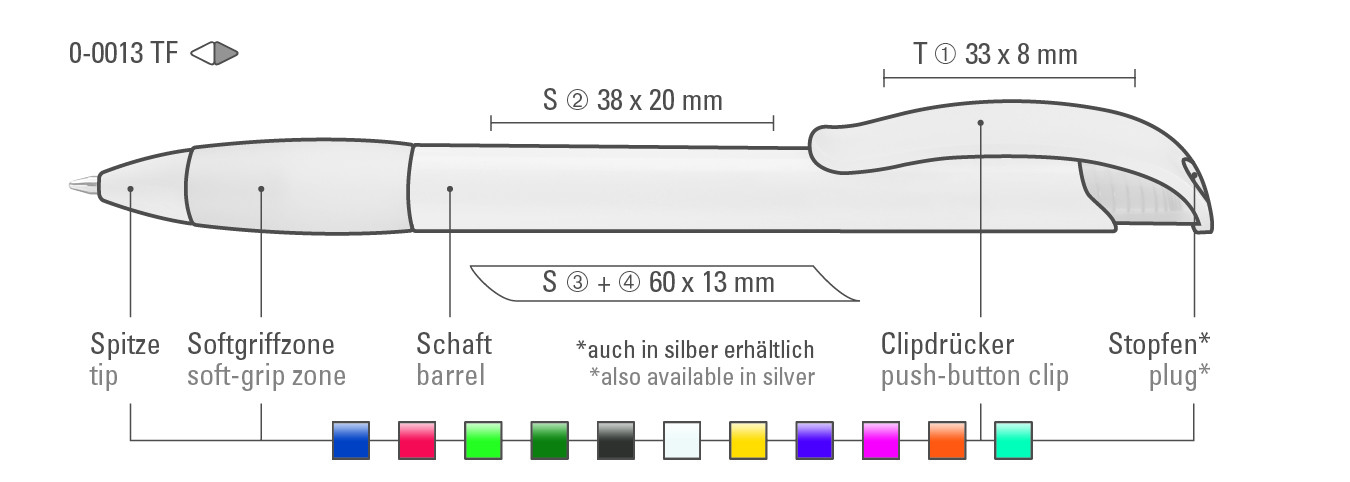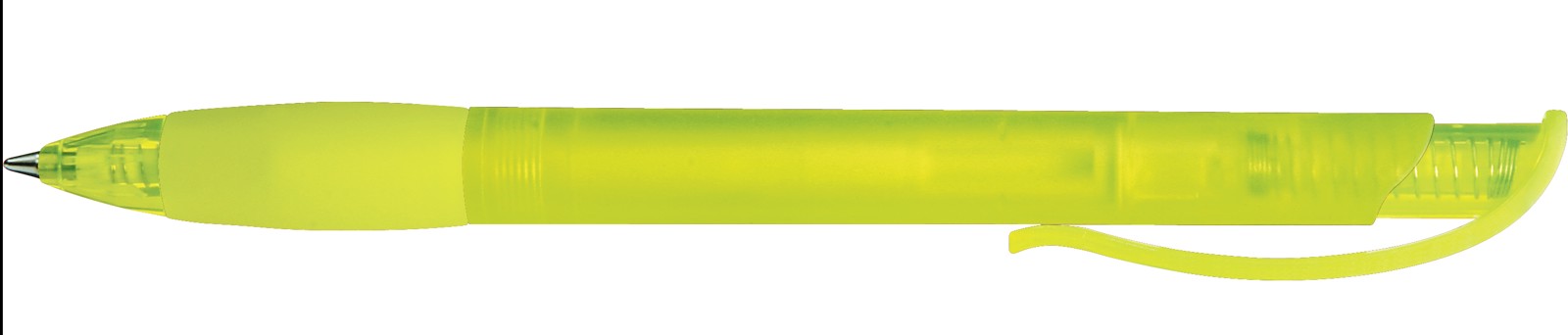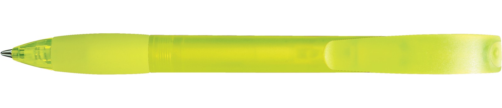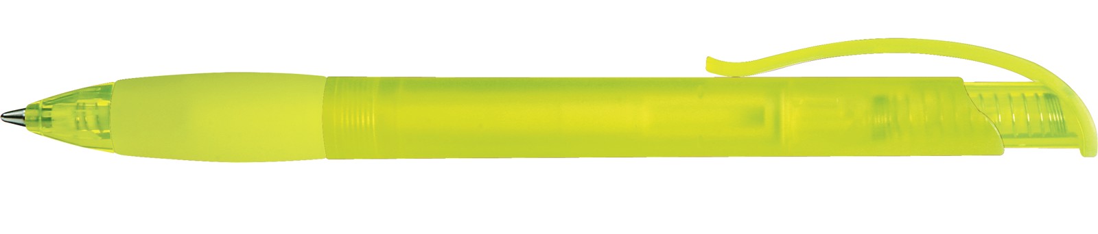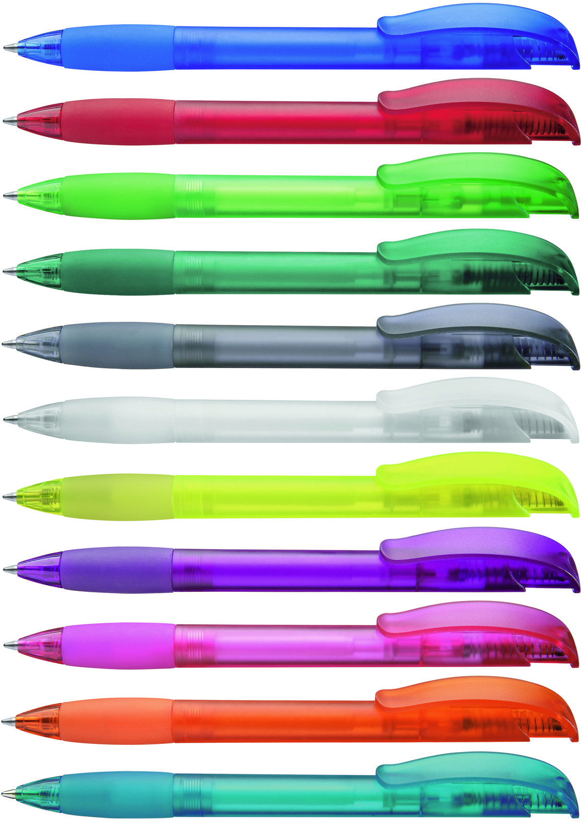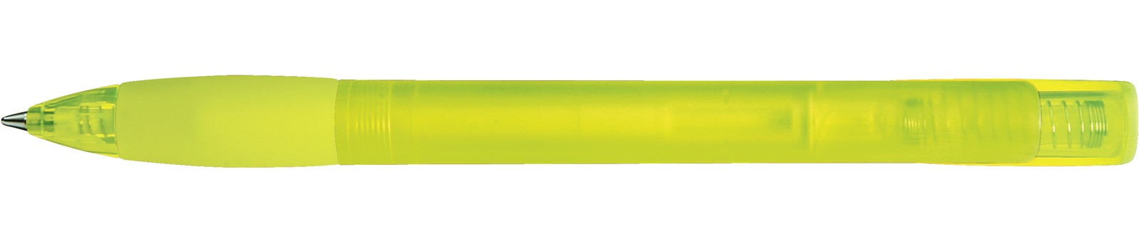 Druckkugelschreiber mit transparent gefrostetem Gehäuse, Gummigriffzone und Clipdrücker mit Stopfen.