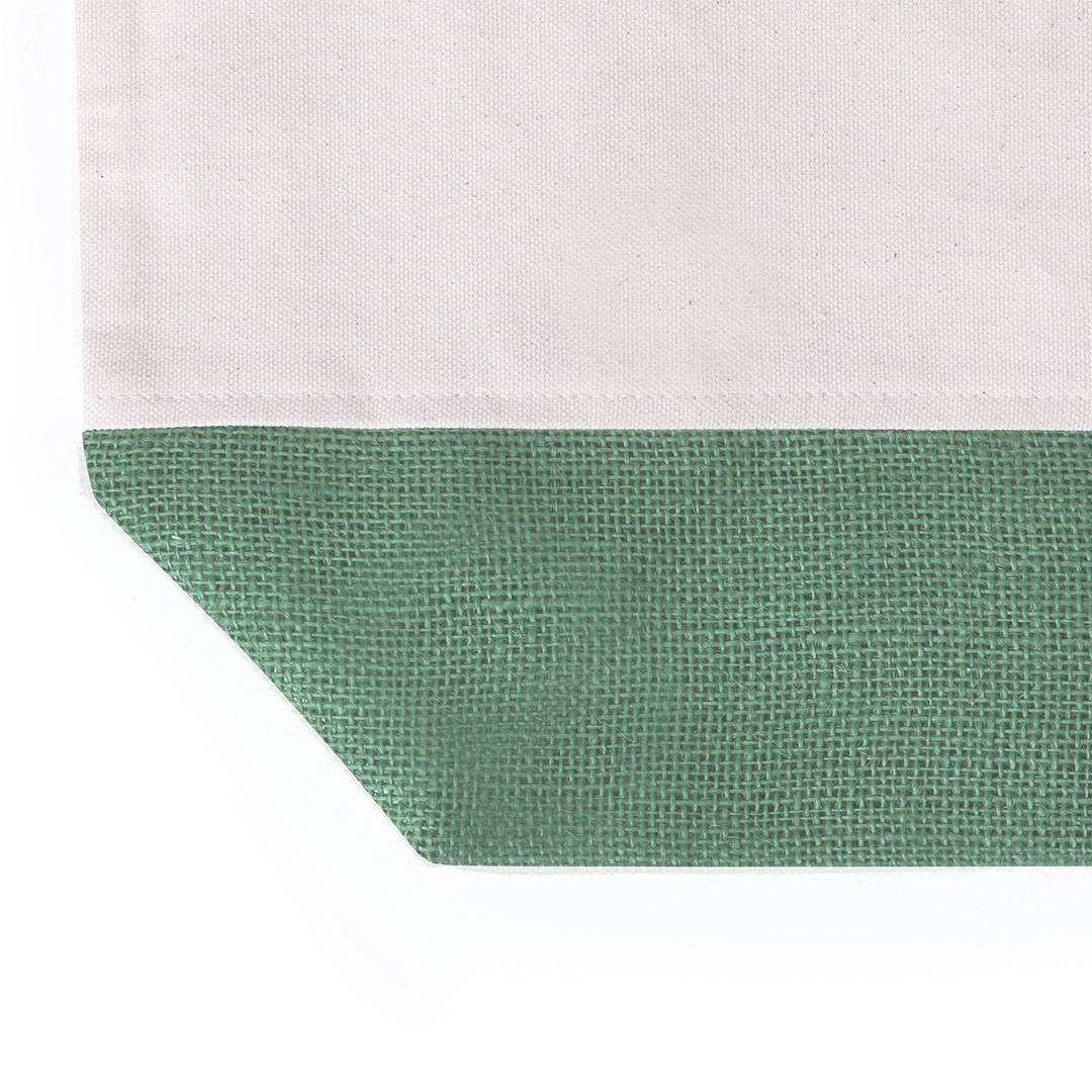 Ökologischer Jutebeutel in Naturfarbe und mit 52 cm langen, grünen Tragehenkeln. Belastbar mit bis zu 9 kg.