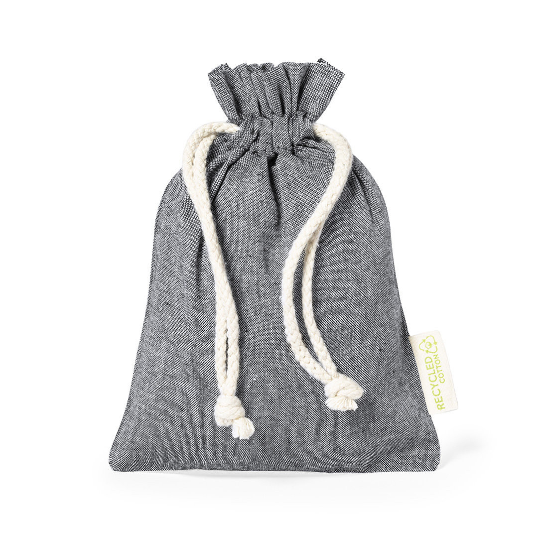 Umweltfreundliche Tasche aus widerstandsfähigem, recyceltem Baumwollmaterial von 120 g/m2. GRS-Zertifizierung (Global Recycled Standard), die die recycelte Herkunft des für die Herstellung des Produkts verwendeten Materials garantiert. Kordelzugverschluss aus Baumwolle und genähtes Finish, einschließlich Außenetikett mit Logo aus recycelter Baumwolle.