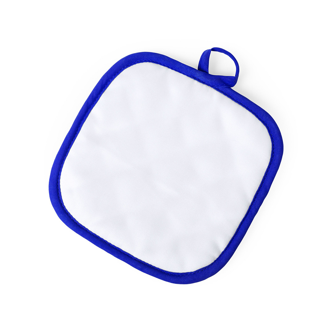 Weicher Topflappen aus 100 % Polyester in Weiß, mit Rändern in kräftigen Farben. Mit Schlaufe zum Aufhängen und einer glatten Seite - speziell für den Sublimationsdruck entwickelt. Eine Flache Seite zum Bedrucken