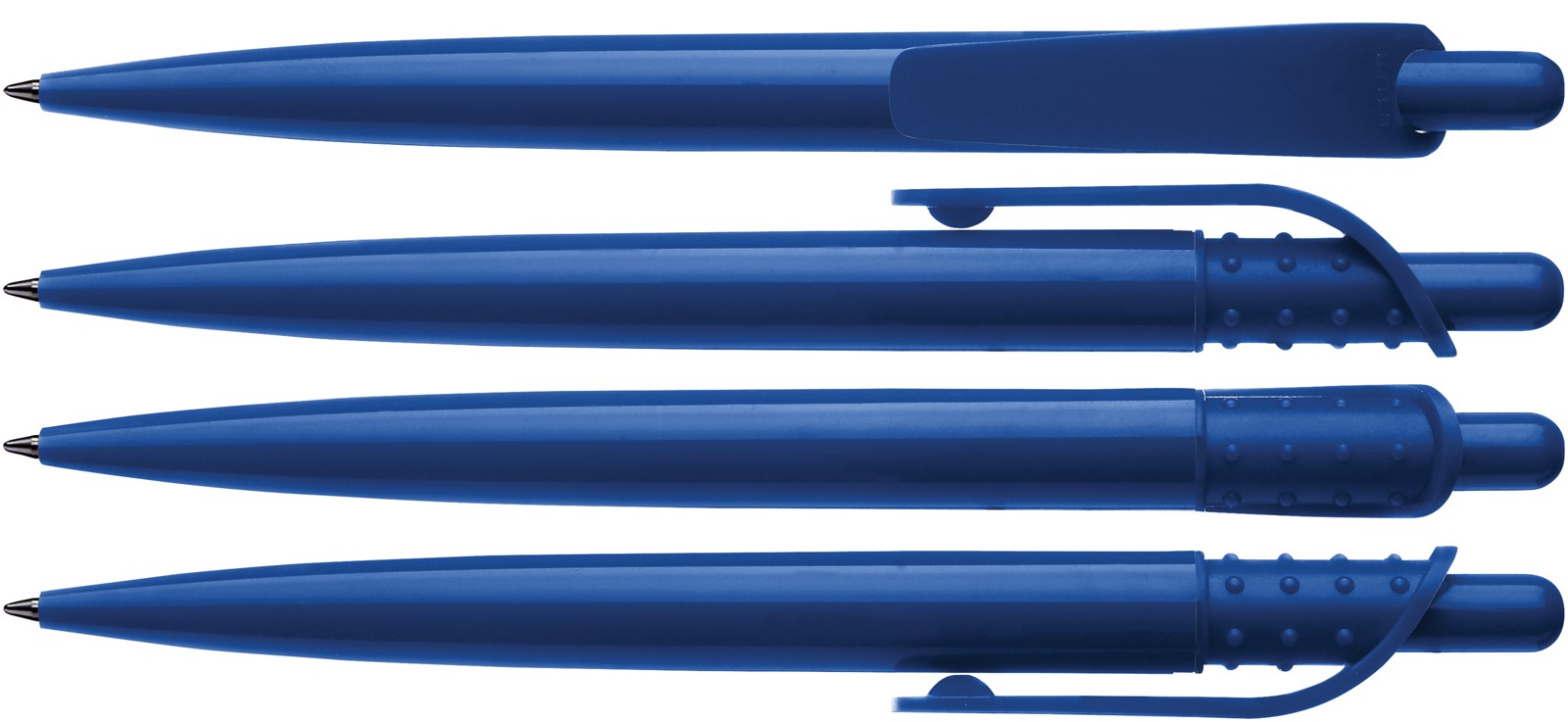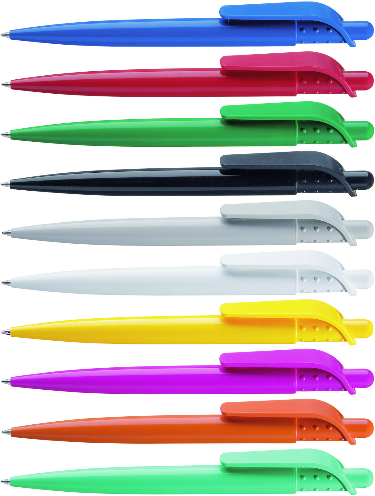 Kugelschreiber aus strapazierfähigem ABS mit Druckknopfmechanik. Originelles zweifarbiges Design mit kräftigen und abwechslungsreichen Farben in glatter Ausführung, mit passendem Komfortgriff. Blaue Tinte.