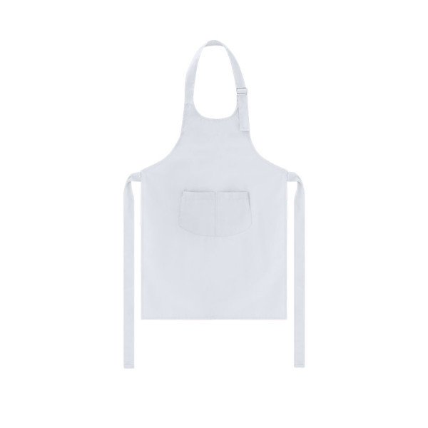 Child's apron made of high-quality cotton and polyester blend. With practical double front pocket and neck ties with chrome adjuster. Cut below the knee providing excellent coverage. One Size. Kids