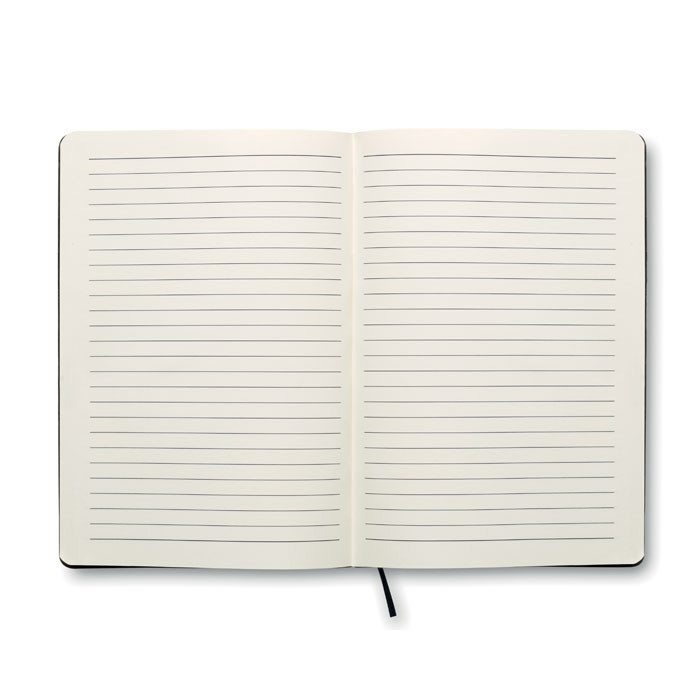 + A5 notebook with soft PU cover. Casebound. With 160 lined recycled paper pages (80 sheets).