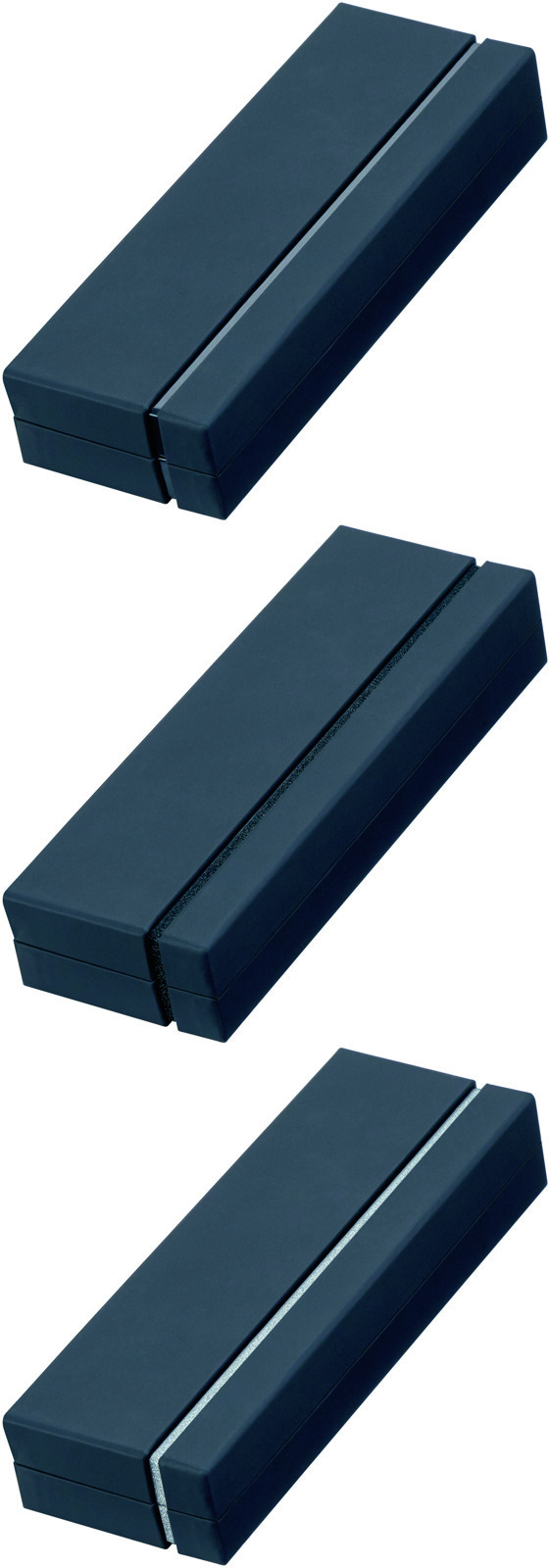 Two-piece, heavy cardboard case in black with removable lid, decorative stitching in glossy black, black gliterring or silver glittering and pillow inlay for one or two writing instruments.