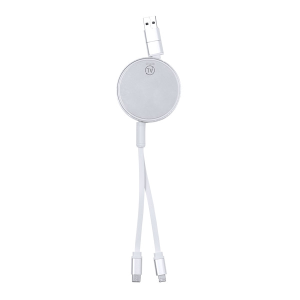 Extendable charger and synchroniser cable, suitable for data transfer and made of recycled aluminium with metallic finish. Central housing with large branding surface, specially designed for laser engraving. Available in a wide range of colours, with matching cables. Type C and USB input connections, with Lightning, Micro USB and Type C outputs. 5V DC 2.4A. Packed in an individual kraft design bag.Recycled Aluminium is a material with almost infinite recycling possibilities, keeping its original properties and consuming less energy during this process.GRS Certification (Global Recycled Standard), which guarantees the recycled origin of the material used to manufacture the product. Extendable Cable. Micro USB, Type C and Lightning Connection 5V DC 2.4A