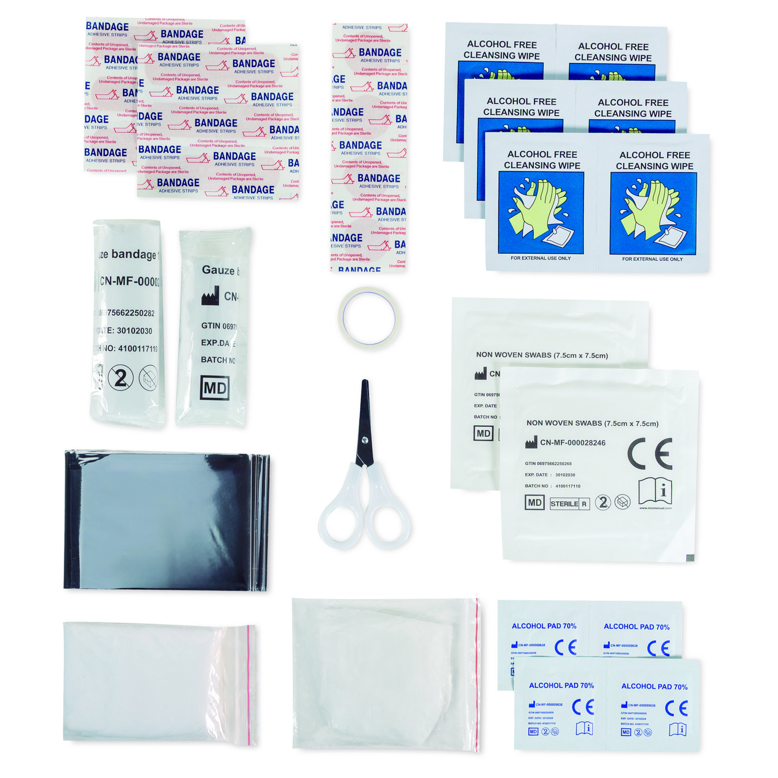 Emergency kit with 20 accessories in a sturdy 600D polyester case with single pull zipper closure. Includes sterile gauzes, bandages, alcohol towels, adhesive tape, safety pin, and scissors. With straps for hanging to facilitate better transport. 20 Accessories