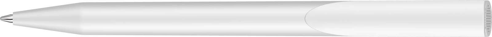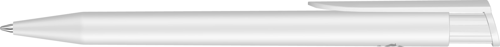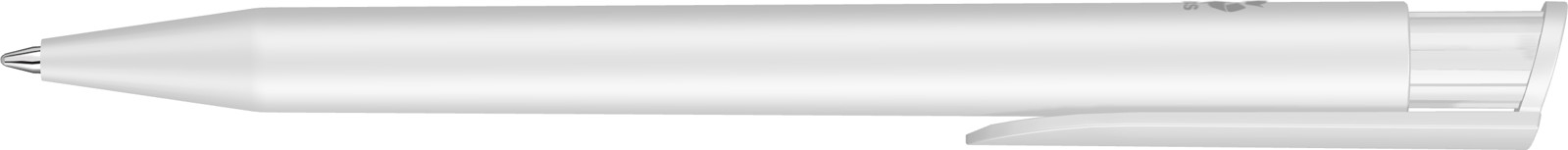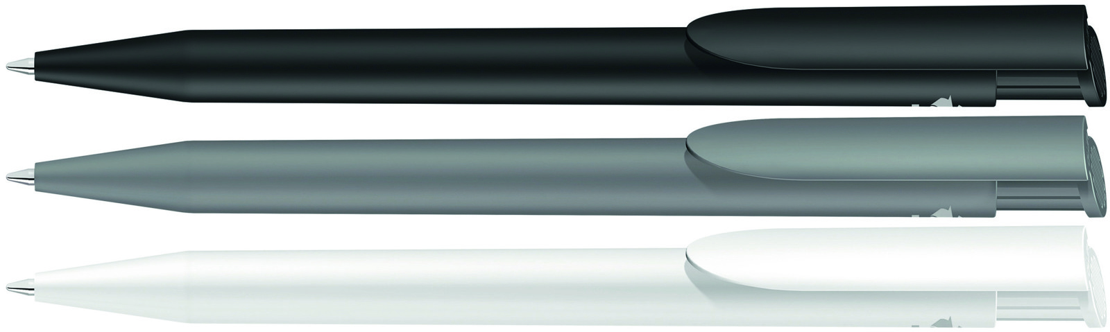 Retractable ballpoint pen with opaque matt housing and clip button made of recycled plastic.