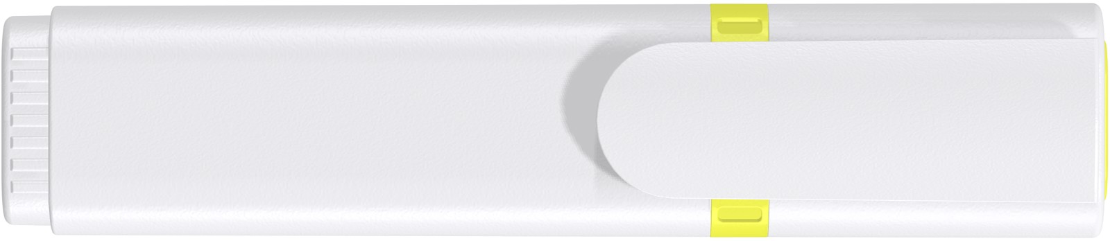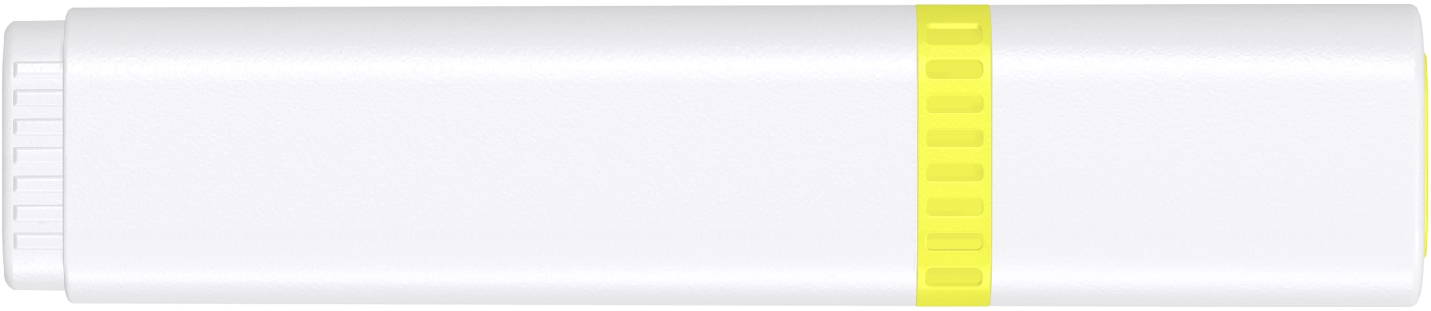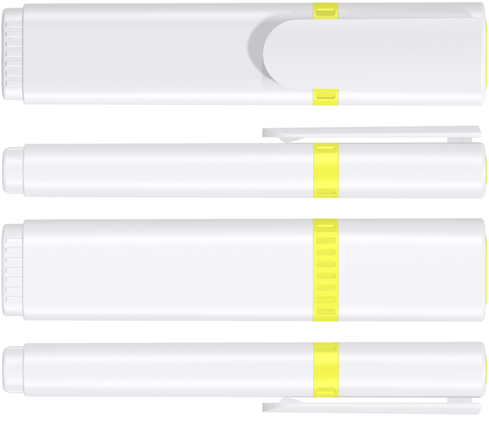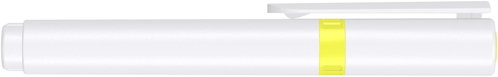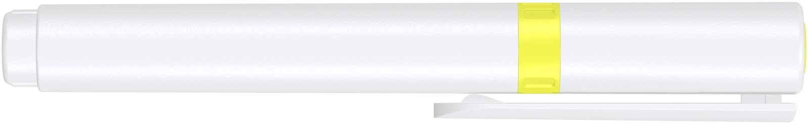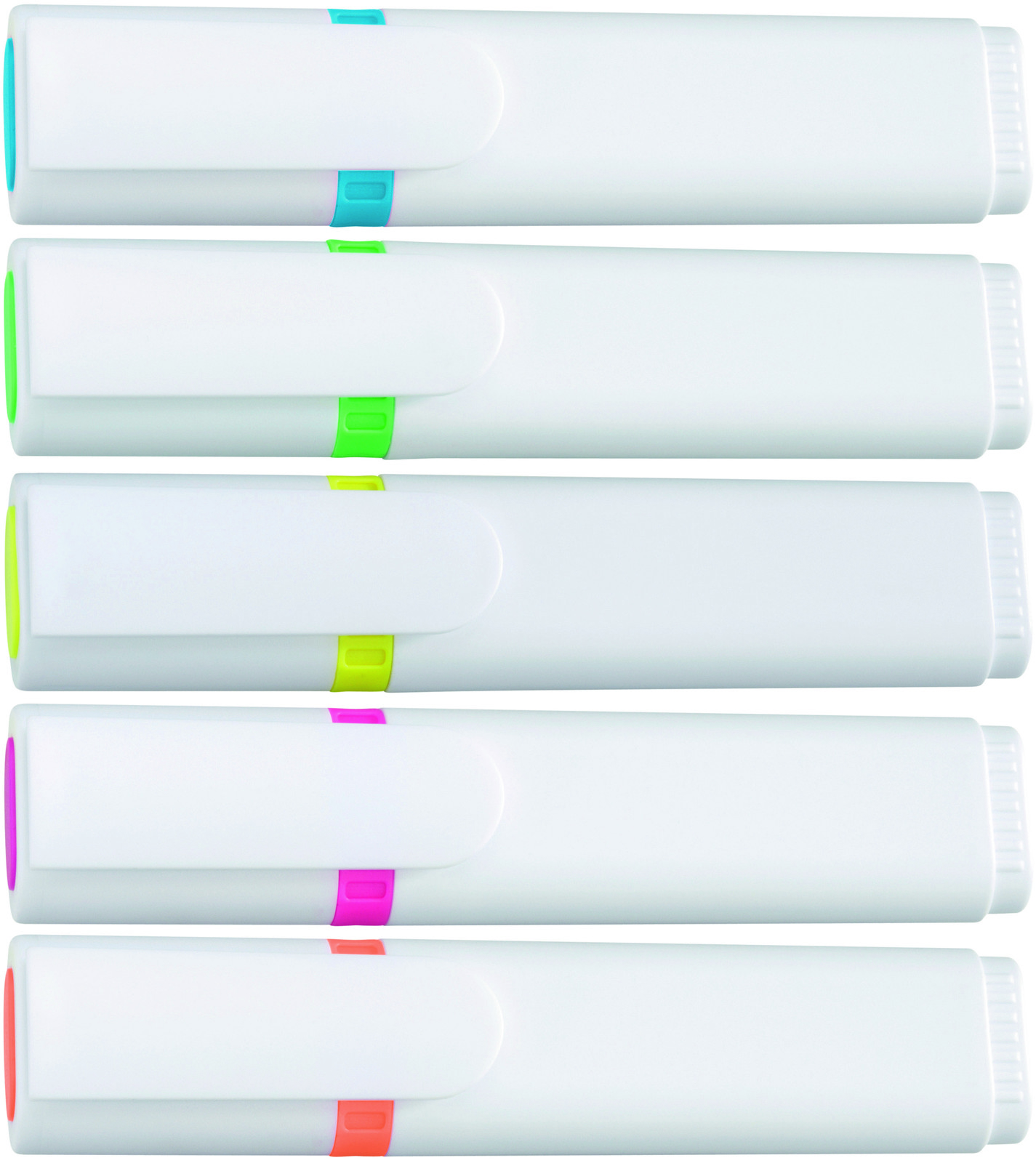 Highlighter with plastic housing, cap and clip in white. Section with ring and plug in writing colour. Standard colours are yellow, green, magenta, blue, orange.