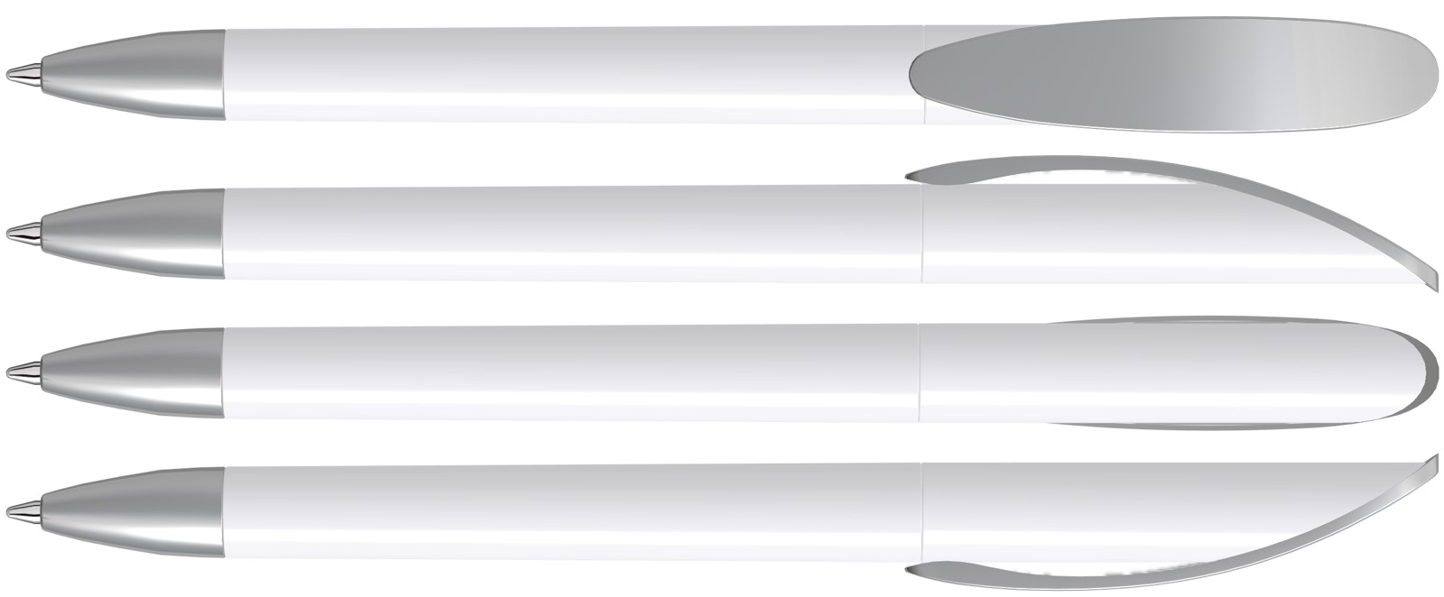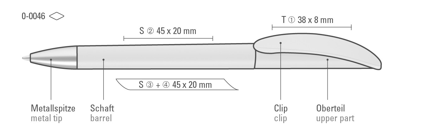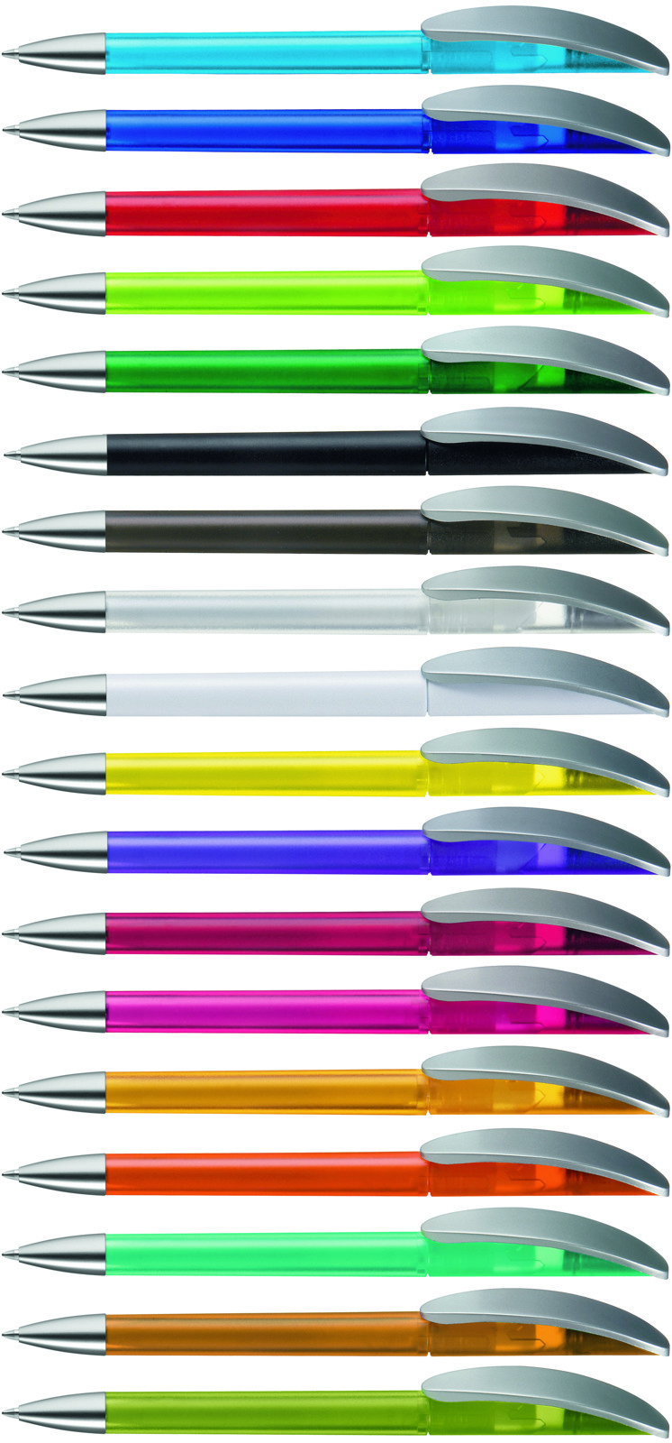 Twist ballpoint pen with transparent frosted or opaque matt housing, curved clip silver matt and heavy metal tip matt chromed.