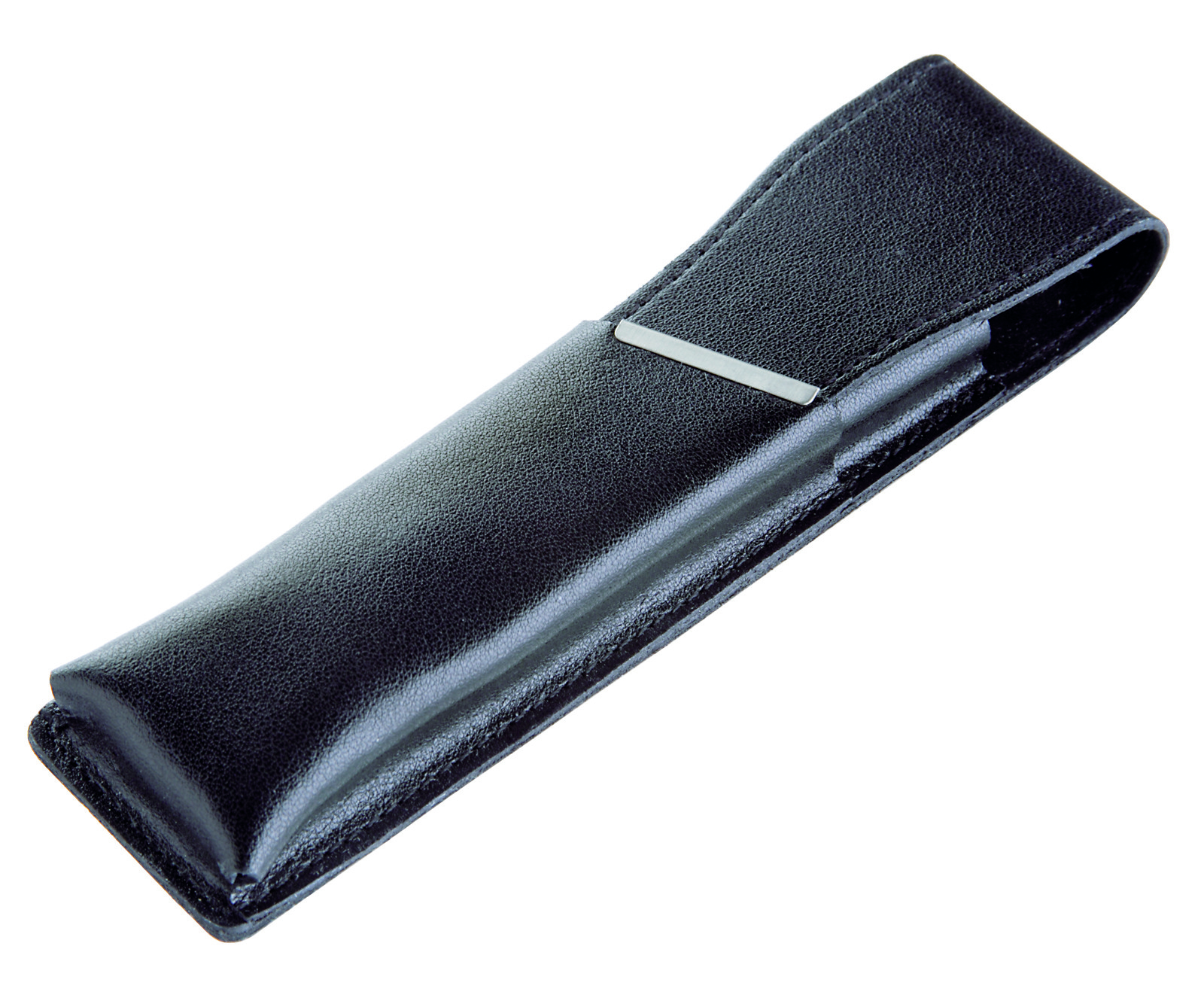 Black leather case for one or two writing instruments with silver-coloured metal strip.