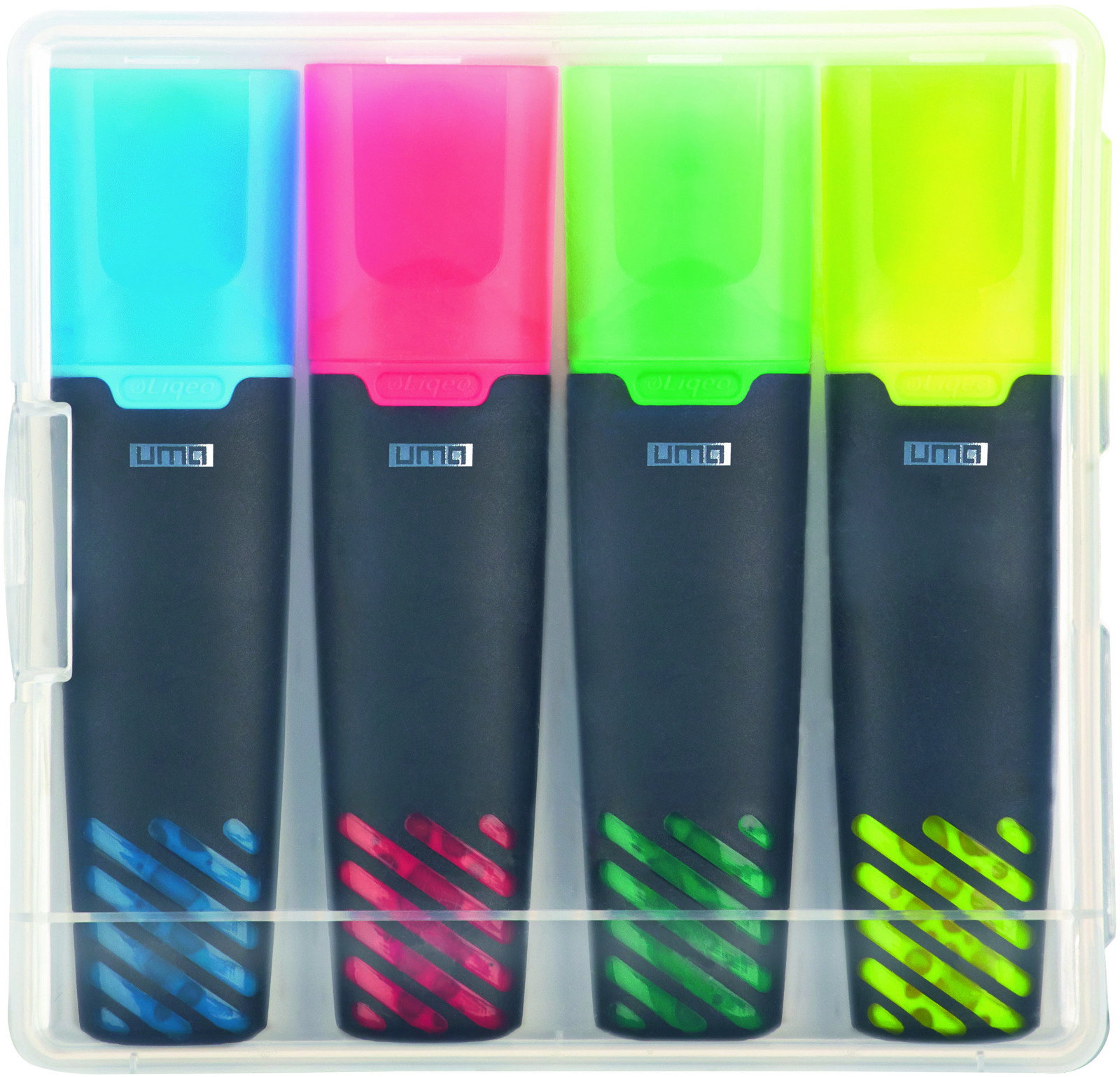 Liquid highlighter set consisting of 4 LIQEO HIGHLIGHTERS in clear transparent plastic packaging. Standard colours for highlighters are yellow, green, pink and blue. Optional colours orange and purple can be chosen.