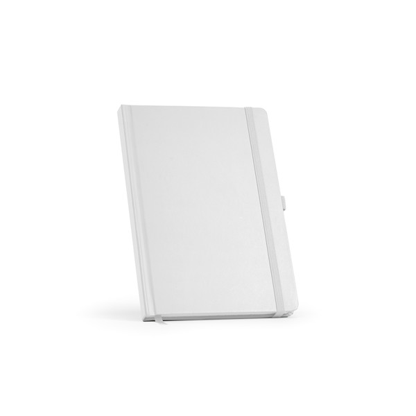 A5 notepad with hard cover in durable recycled cardboard. With 100 blank white sheets and elastic closing band. Available in a wide range of colors. Hard Cover. 96 Sheets