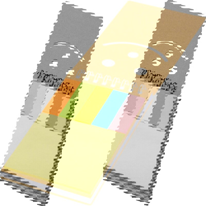 Notepad holder with soft-touch covers in resistant, shiny rigid cardboard and in original colors. With 200 blank sheets and 125 mini sticky notes. 200 Sheets 7,6 x 7,6 cm. 125 Mini Sticky Notes 1,5 x 5 cm