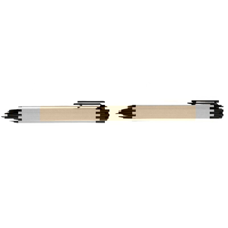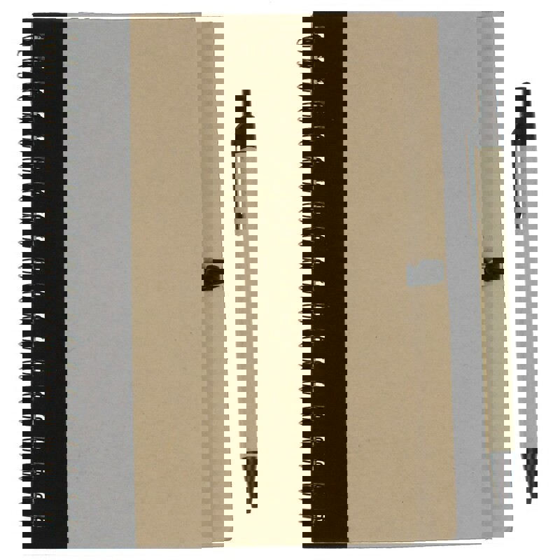 Notebook in approx. A5 size with 60 lined sheets (120 pages), features spiral binding, ball pen with coloured elements included, writes in blue, cover made of carboard with coloured detail next to the spiral binding