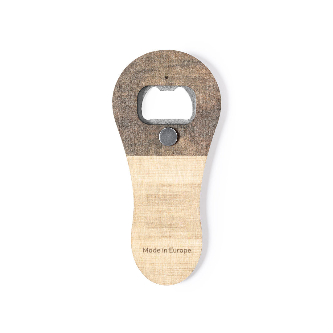 Magnetic opener made in natural wood with an original bicolor finish. With metal opening mechanism, large branding surface and Made In Europe logo. Magnetic