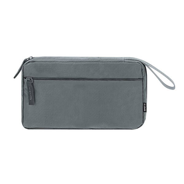 Organiser case made from 900D RPET. Full opening main pocket with double metal puller and multiple interior pockets ideal for storing cables: 3 pockets with elastic bands and 1 with a zipper closure. It also includes an exterior pocket with an invisible zipper closure and a handle for easy carrying. It includes an RPET label.RPET material is made from recycled plastic, thus promoting the reuse of plastic waste and helping the sustainability of the planet.