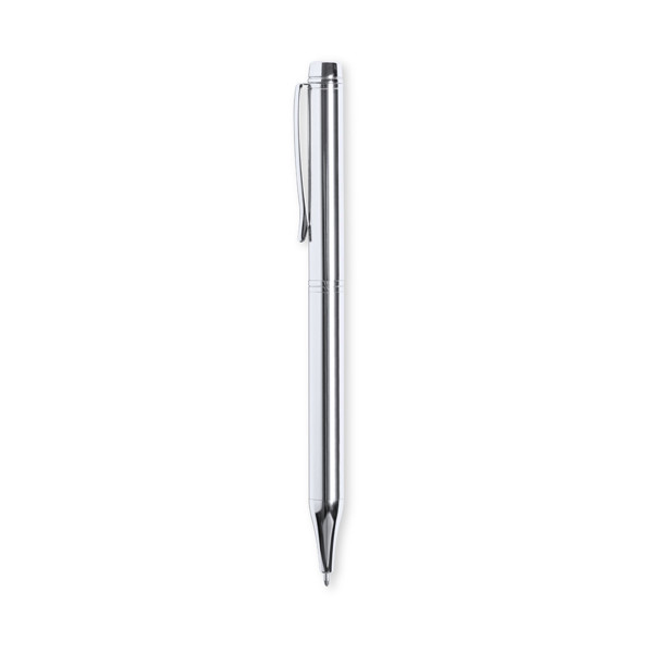 Pointer ball pen with twist mechanism and ultra-fine aluminum body in a smooth metallic finish in varied colors and matching color stylus. Details and rings in silver color. Blue ink.
