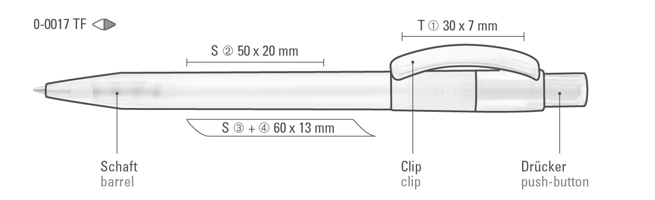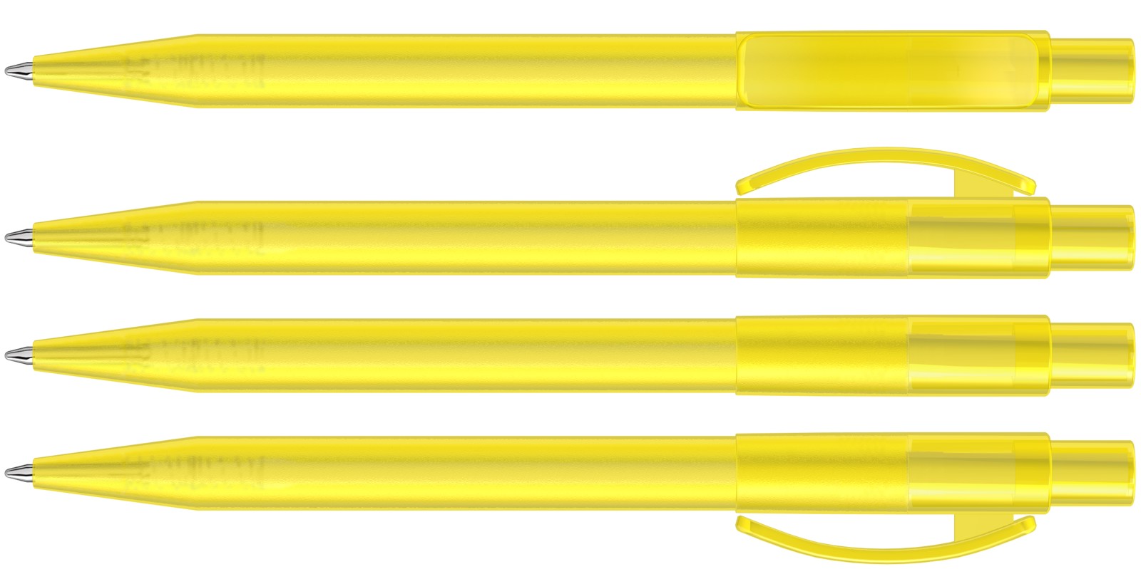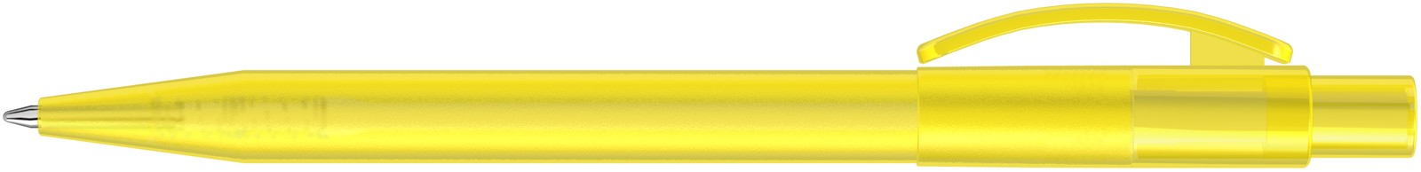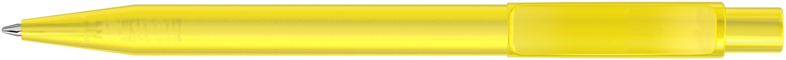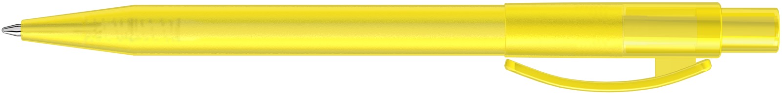 Retractable ballpoint pen with transparent frosted housing, transparent glossy curved clip and push-button.