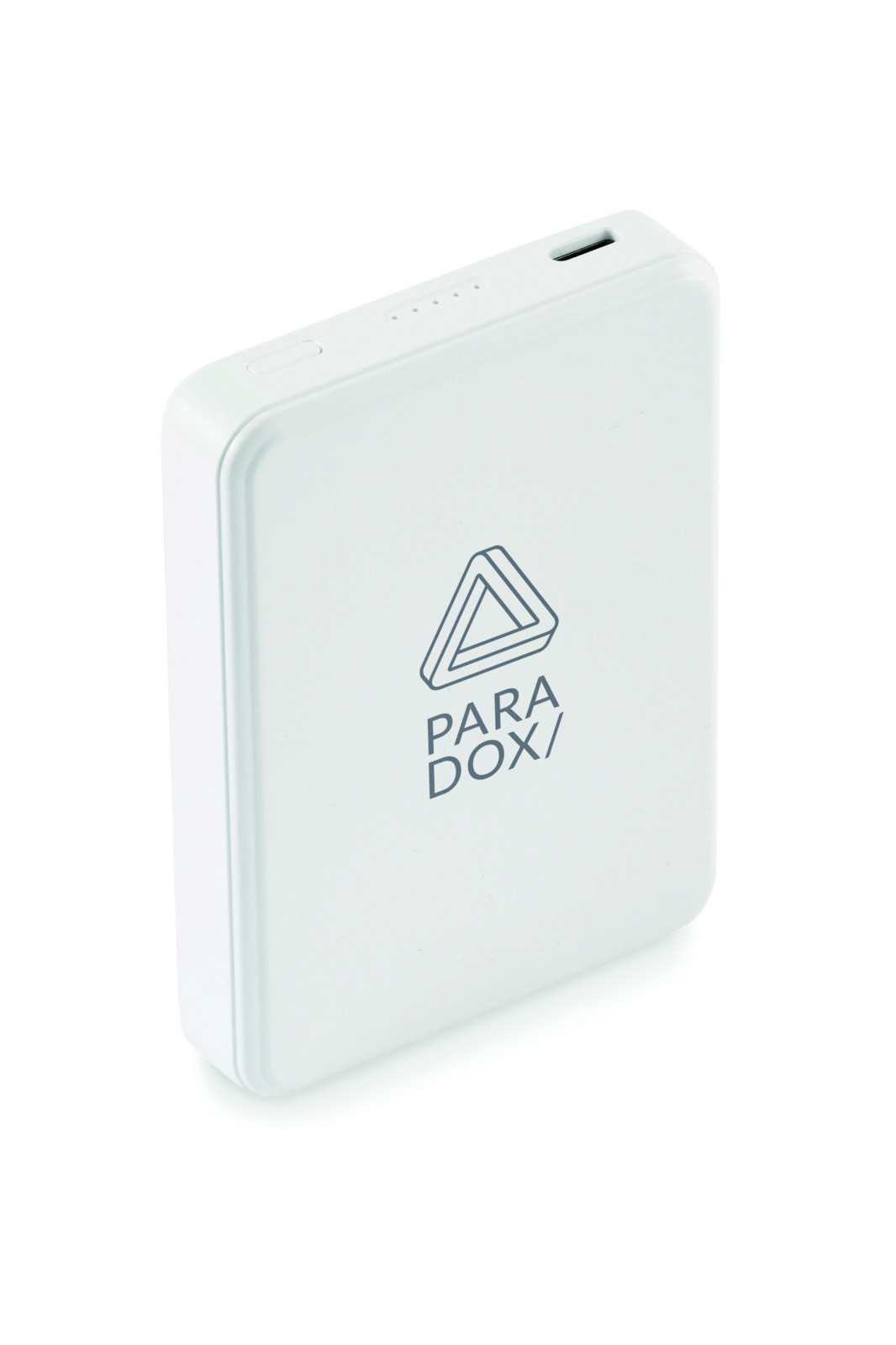 Powerbank PD 20W. 5000 mAh. Recycled ABS (GRS). Outputs: USB-C up to 20W. Input: USB-C 18W. 4 LED indicators. USB-C to USB-C cable (2A) with USB-A adapter included