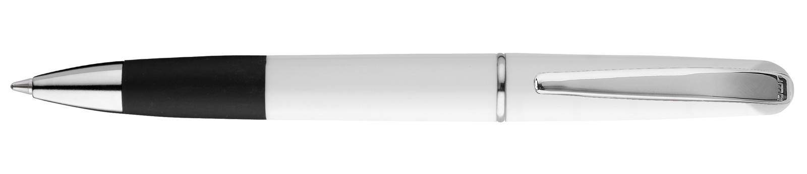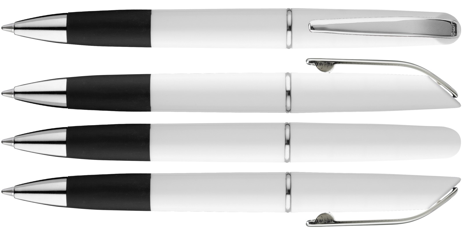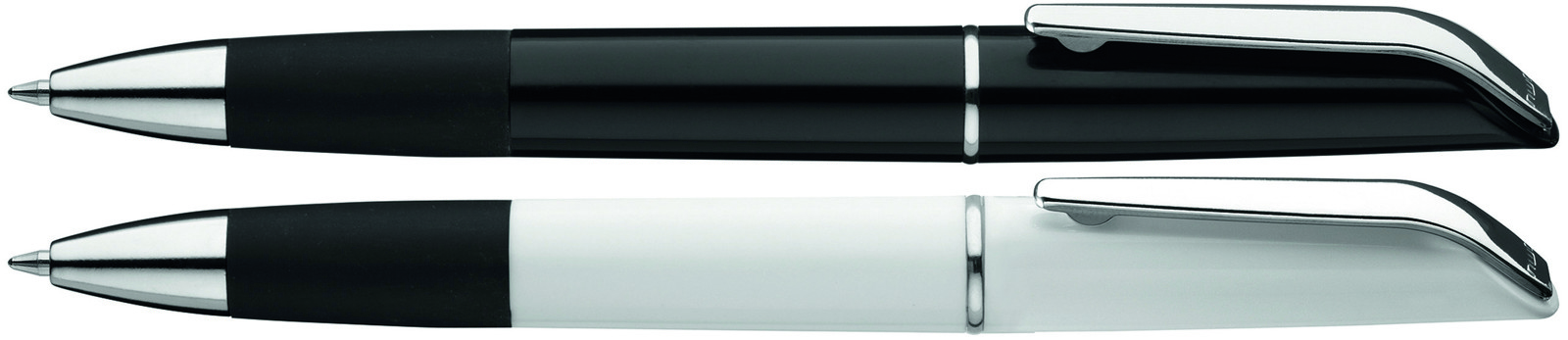 Twist ballpoint pen with opaque glossy housing and rubber grip zone in black. Metal clip, decorative ring and tip chrome plated.
