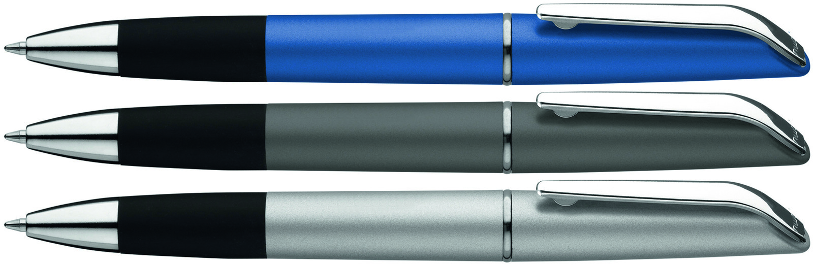 Pointer ball pen with twist mechanism and ultra-fine aluminum body in a smooth metallic finish in varied colors and matching color stylus. Details and rings in silver color. Blue ink.