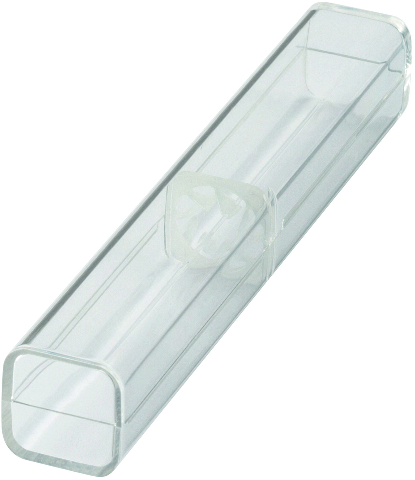 Transparent plastic case with plastic holding ring. The ballpoint pen is fixed floating in the case.