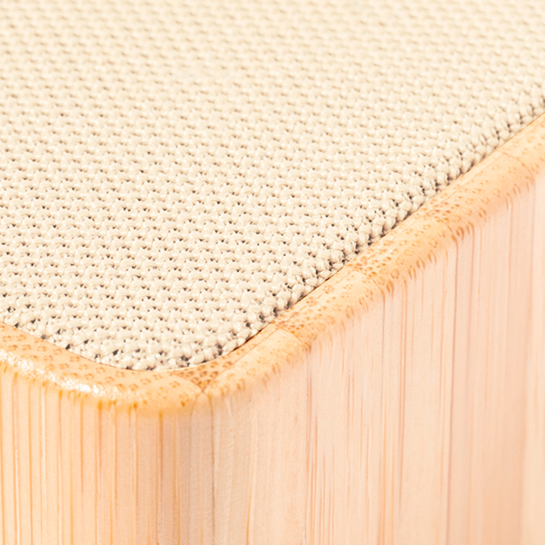 Wireless speaker with Bluetooth® connection and 3W power. With natural bamboo housing in combination with cotton upholstery. Compact in size and with useful cotton carrying handle. 300mAh lithium battery, Type C charging cable included. Presented in an individual kraft design box. Instruction manual available in English and Spanish.Materials such as bamboo promote the use of natural raw materials and reduce pollutant emissions. In addition, bamboo comes from a highly resistant and versatile plant, with fast growth and regeneration, being an excellent alternative to the use of traditional wood. Bluetooth Connection. Sound Power 3W. Battery 300 mAh