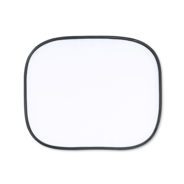A set of 2 foldable sunshades for car windows, made from durable polyester. Lightweight and measuring 44 x 36 cm each, with reinforced edges and attachment via suction cups (4 units included). Comes with a simple folding system and an individual matching cover. Special white color for sublimation. 2 Pieces. Foldable. Polyester Pouch