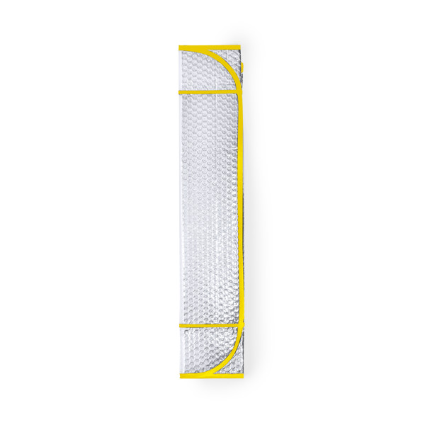 Aluminium sunshade with bubble on both sides. Metallic silver finish, with black piping and in size 130 x 70 cm. With elastic bands for folding and supplier unfolded for easy printing.