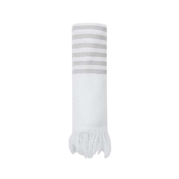 Soft pareo-towel of 300 g/m², made from a combination of recycled cotton and recycled polyester SEAQUAL. Its design features a white base combined with colored stripes and distinguished fringes at the ends. Includes SEAQUAL design label, certifying its sustainable origin and contribution to ocean cleaning. The SEAQUAL INITIATIVE works with collaborators and authorities to help clean our oceans. Marine waste from our beaches, ocean floors, and surfaces, rivers, and estuaries is collected through cleaning programs. It is then sorted into different types of materials, and the plastic portion is cleaned and transformed into RECYCLED MARINE PLASTIC, a fully traceable raw material that creates sustainable and inspiring products. By choosing products that contain RECYCLED MARINE PLASTIC, you are helping to clean our oceans. TOGETHER FOR A CLEAN OCEAN.