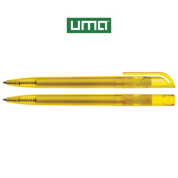 Twist ballpoint pen with transparent frosted housing.